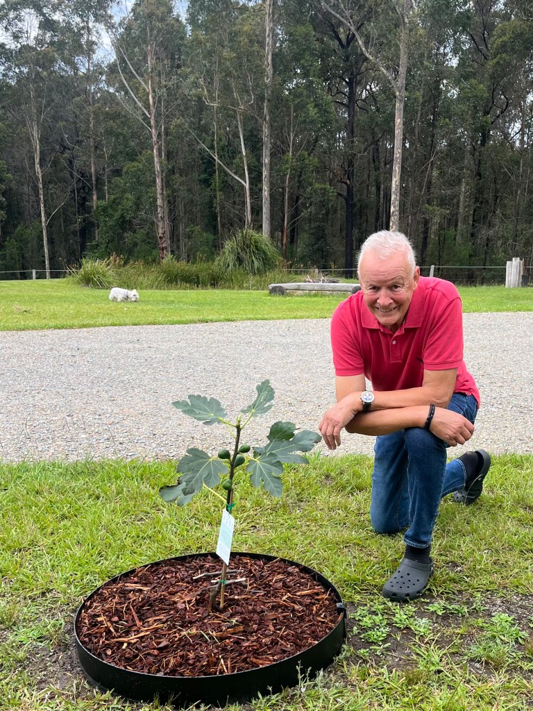 Our lovely neighbours at the Bawley Vale Winery, Marg & Chris, gave us a fig tree for Xmas. Kim and I decided to plant it to mark my final chemo session, on 3 January. Evidence below, with my “assistant” Maisie, in the background!